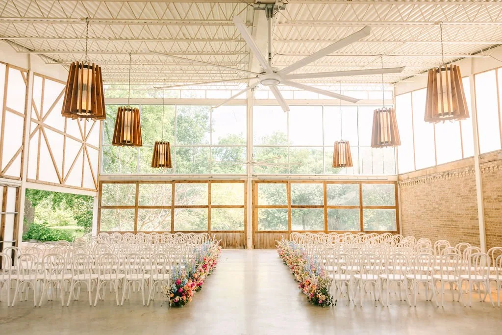 A 40’ wall of glass with natural vines provides the perfect backdrop to bring the outdoors in, while saying your I Do’s in the comfort of a climate-controlled space.